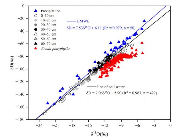 在兩年的時間里,在純白樺林內建立的 30 m × 30 m 的樣地內進行了季節性田間試驗。作者選擇了五棵健康的白樺木,其高度和胸徑接近研究區域的平均值。樣地土壤剖面較淺(厚度約為 40-70 厘米)土壤采樣在每月中旬無雨的日子或降雨后的幾天進行。每月系統采集10 cm、20 cm、30 cm、40 cm、60 cm深度的樹木木質部水和土壤水樣本,進行穩定同位素分析。成熟植物體內水的同位素組成可以反映植物水分來源的同位素組成。2019年和2020年(5月至10月)在樣樹上取樣,每棵樣樹取樣3個重復。使用手動螺旋鉆獲取土壤水樣,并用封口膜密封在玻璃容器中,用于隨后的同位素分析。為了減輕蒸發對同位素含量的影響,所有土壤和植物樣品均被立即冷凍并儲存。在 2019 年和 2020 年的整個生長季節,總共收集了 100 個降水樣品,并用封口膜牢固地密封在干凈的聚乙烯瓶中。然后將這些沉淀樣品儲存在設定為-2°C的冰箱中,直到準備好進行同位素分析。