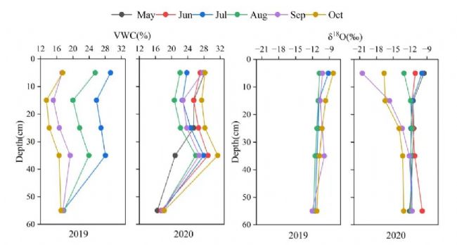 2019年和2020年各月VWC垂直土壤剖面和土壤水δ18O值