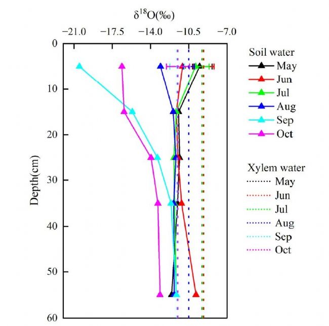 來自內蒙古農業大學的研究團隊在北京師范大學地表過程與資源生態學國家重點實驗室地理科學學院和水利部草原水利科學研究所實驗中心采用全自動真空冷凝抽提系統(LI-2100,北京理加聯合科技有限公司)對植物和土壤樣品進行水分提取。雨水和提取的植物和土壤水經過過濾,使用0.22μm有機相針式過濾器去除雜質和有機污染物。根據土壤剖面,土壤水源分為淺層(0~20 cm)、中層(20~40 cm)和深層(40~60 cm)。值得注意的是,由于樣地地勢多為山地,地下水的可用性可能受限,因此將地下水排除作為樹木的潛在水源。