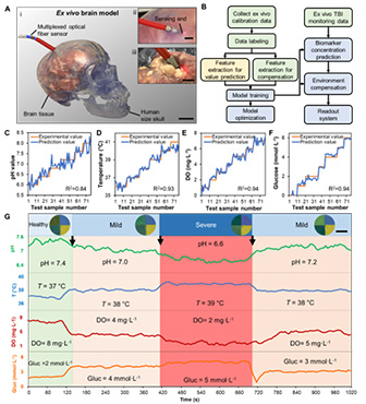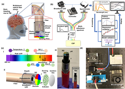 該成果報道了一種集成了可編程的AI 預測平臺的多路復用生物標志物光纖光學傳感器。該傳感器能夠實時且連續探測腦脊液中多種生物標志物的水平,并診斷和動態監測顱腦損傷的不同階段。