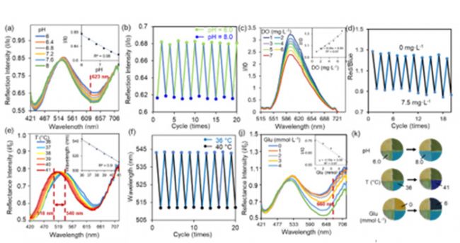 該研究團隊利用多路復用傳感器對人工腦脊液(aCSF)的pH、腦氧含量(DO)、溫度和葡萄糖進行了同時檢測,測量結果如下。如圖所示,該光纖傳感器在進行多參量同時監測的時候區分pH、DO、溫度和葡萄糖,同時該傳感器具有良好的重復性,可以反復使用。并且,傳感薄膜在不同的生理環境中具有肉眼可見的顏色變化,證實了該傳感器可以有效地檢測aCSF中的生物標志物(圖2)。