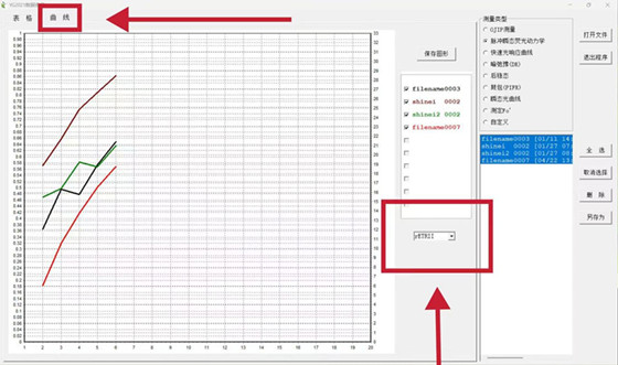 在表格模式下的脈沖瞬態熒光動力學模塊,按住 Ctrl 鍵可以多選文件名框中的文件進行數據查看,可以用來比對多項脈沖瞬態熒光動力學數據,表格模式如圖2.8。在曲線模式下的脈沖瞬態熒光動力學模塊,按住 Ctrl 鍵可以多選文件名框中的文件進行曲線查看,由于脈沖瞬態熒光動力學數據較多,需要在操作欄中選擇一項數據進行比對,曲線模式如圖2.9。
