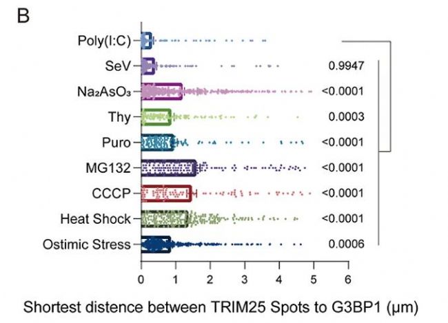 (A) 具有代表性的熒光顯微鏡圖像顯示了在各種應激條件下 TRIM25 與 HeLa 細胞中內源性 G3BP1 的共定位。(B) TRIM25 和 G3BP1 病灶之間的最短距離。在 HeLa 細胞中,各種應激類型如(A)所示。在所有應激類型中,Sev 感染和 poly(I:C) 處理導致的距離最短。