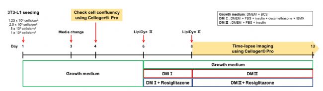 因此,為了評估細胞初始密度如何影響脂肪細胞的分化,我們以四種不同密度播種3T3-L1細胞。此外為了確定羅格列酮對分化過程的影響,將實驗分為兩組,一組是含有羅格列酮的DM,另一組是不含羅格列酮的DM(圖3)。