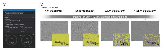 在接種細胞后,我們在第四天使用Celloger的延時成像功能評估它們的融合度。(a) cellloger掃描軟件延時成像窗口 (b)分析細胞融合度的圖像