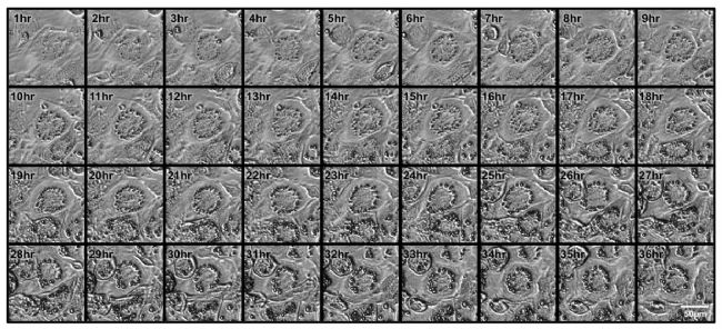 該Time-lapse顯示DM II和羅格列酮處理后1小時至36小時每間隔1小時拍攝的圖像 (使用10倍放大,裁剪圖像)