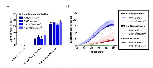 圖8 脂滴面積的定量取決于細胞密度和羅格列酮給藥