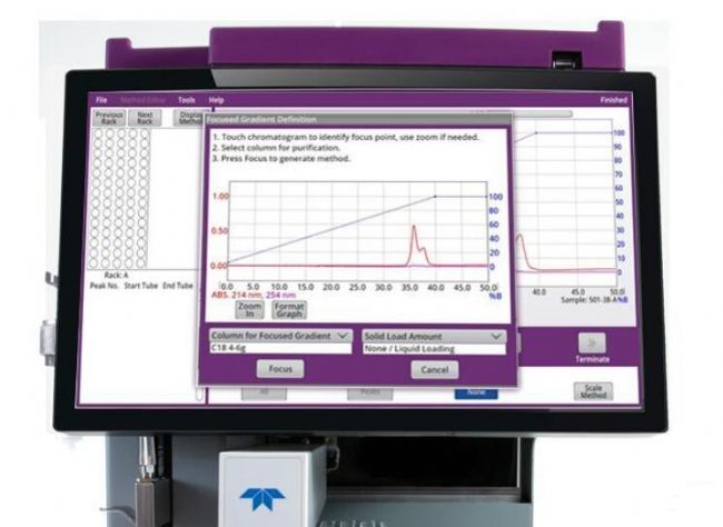 我們根據(jù)蒸發(fā)光散射檢測器(ELSD)訊號作為分析物偵測與峰收集。其中噴霧室設(shè)為 20°C,漂移管設(shè)為 60°C。將紫外-可見光檢測器在 254 納米以及 200-800 納米范圍內(nèi)設(shè)置為“監(jiān)控”模式,因此不會由紫外-可見光檢測器觸發(fā)峰收集。紫外追蹤證實了溶劑更換正在進(jìn)行。我們使用了純正庚烷以及不含穩(wěn)定劑的四氫呋喃。如同薄層色譜法(TLC板)使用的硅膠,因此很容易將TLC的沖洗方法轉(zhuǎn)移到柱子上。