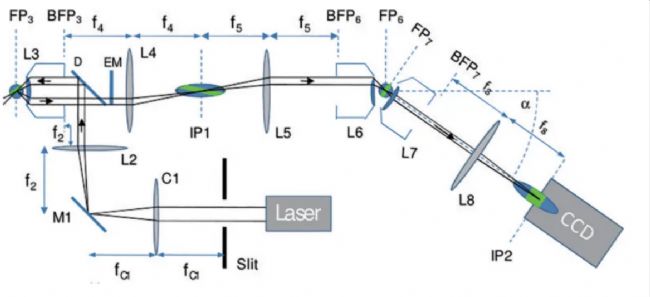 圖1 傾斜平面照明顯微鏡光路,用同一物鏡生成光片并成像,引入遠(yuǎn)程聚焦系統(tǒng)修正照明角度傾斜