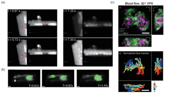 圖2 傾斜平面照明顯微鏡用于快速生命活動成像。(a)OPM實現(xiàn)對心臟中鈣火花的3D成像;(b)OPM實現(xiàn)對心肌收縮鈣波傳播的觀測;(c)SCAPE 2. 0以321volume/s的體積成像速度實現(xiàn)對心臟與心房間的血流動力學(xué)觀測