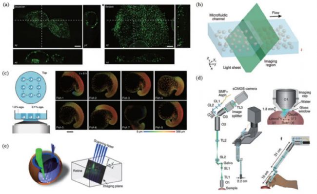 圖3 OPM在生命科學(xué)與醫(yī)學(xué)檢查場景的廣泛應(yīng)用。(a)OPM的高分辨率成像;(b)OPM用于流式細(xì)胞檢測;(c)DaXi-OPM實現(xiàn)對9個斑馬魚胚胎的同時成像;(d)Medi-SCAPE用于活體腫瘤檢測;(e)利用人眼作為天然物鏡,實現(xiàn)對眼底視網(wǎng)膜成像