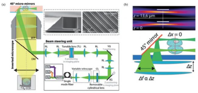 圖4 微鏡反射的單物鏡光片顯微鏡。(a)基于45°微鏡的單物鏡光片顯微鏡的光路,右上角為掃描電子顯微圖像;(b)利用ETL進(jìn)行軸向位移,使光片中心橫向位置保持不變