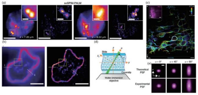 圖5 結(jié)合單分子定位方法的單物鏡光片顯微鏡。(a)soSPIM-PLAM成像,左邊寬場,右邊超分辨;(b)soSPIM-dSTORM超分辨成像,左邊寬場,右邊超分辨;(c)組織深度為50μm的代表性體積obSTORM圖像,十張圖像堆疊,深度顏色編碼;(d)obSTORM高傾斜角度的光片入射;(e)光片角度下理論和實驗PSF的對比。