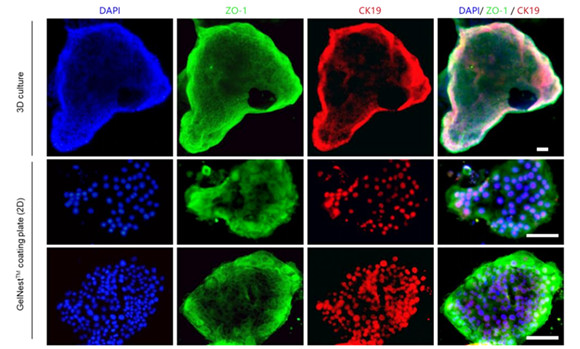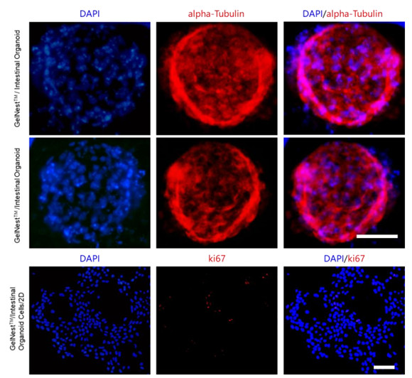 可觀察到在 GelNestTM 基質膠中(3D)或者在基質膠薄層上(2D)生長的小腸類器官均能很好的保持生物功能性細胞標志物的表達。