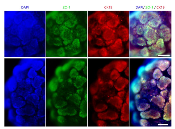 DAPI 為細胞染料核(藍色);ZO-1 為細胞緊密連接蛋白標志物(綠色);CK19 為上皮細胞特征標志物。標尺為 100微米。