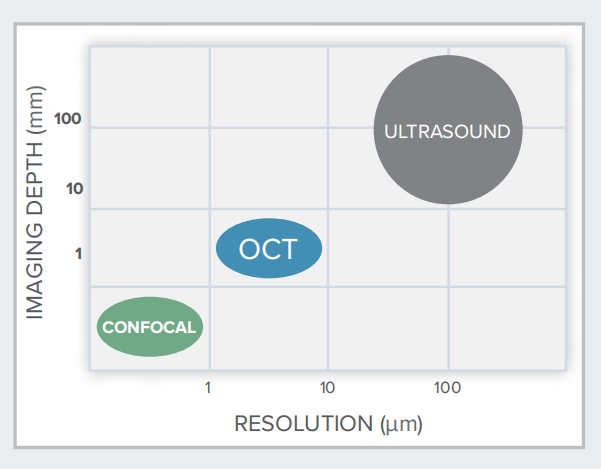 光學相干斷層掃描是超聲波的光學版本,它使用紅外激光探測樣品,記錄光頻率的干涉圖,并使用光譜儀進行分析以生成橫截面圖像。盡管超聲波檢查被認為是次表面成像的標準,但其速度和分辨率有限,并且需要使用耦合介質。共聚焦成像雖然能提供亞微米級分辨率,但非常昂貴且僅限于小于1毫米的深度。