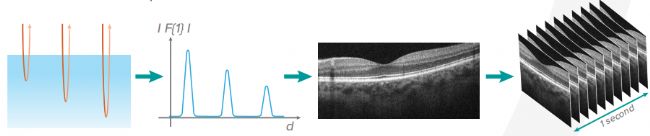 OCT結合低相干干涉測量技術和對樣品的掃描生成一系列橫截面圖像或3D體積圖像。低相干干涉測量有幾種實現方式,但目前主流方式有兩種:掃頻源光學相干斷層掃描(SS-OCT:Swept Source optical coherence tomography)和光譜域光學相干斷層掃描(SD-OCT:Spectral Domain Optical Coherence Tomography)。這兩種方法都使用多波長激光照射樣品,然后測量返回的不同波長的散射光,通過對光譜進行傅里葉變換來檢測不同深度的結構。