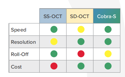 使用Wasatch的Cobra-S OCT 光譜儀的SS-OCT、傳統 SD-OCT 和高速 OCT 的關鍵參數對比