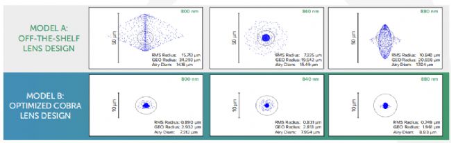 市場上能買到的光學元件往往無法提供高清晰度的OCT圖像,因為獲得良好衰減的光學限制非常嚴格。好的OCT性能要求在整個譜段上,聚焦在每個相機像素上的光斑必須很小,以避免信號擴散到相鄰像素。Wasatch Photonics,的OCT光譜儀定制設計的鏡頭組,提供所有波長下OCT的優化光譜儀性能,遠遠優于使用現成的鏡頭。