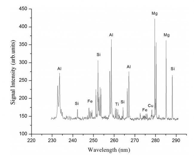 在2017年,Hira Shakeel[2]等人采用標(biāo)定自由激光誘導(dǎo)擊穿光譜(CF-LIBS)對(duì)標(biāo)準(zhǔn)鋁硅合金進(jìn)行了定量分析。利用Nd:YAG激光器的基頻(1064nm)產(chǎn)生等離子體,并在3.5us探測(cè)器柵極延遲下記錄了發(fā)射光譜。發(fā)射光譜定性分析證實(shí)合金中存在Mg、Al、Si、Ti、Mn、Fe、Ni、Cu、Zn、Sn和Pb。利用等離子體溫度和各元素的自吸收校正發(fā)射譜線測(cè)定了合金中各元素的濃度。
