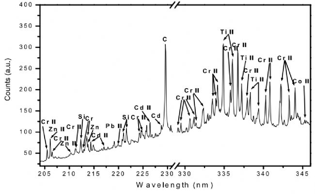 在2009年,S. Pandhija[3]等人采用激光誘導(dǎo)擊穿光譜(LIBS)和免校準(zhǔn)LIBS (CF-LIBS)技術(shù)對(duì)環(huán)境樣品中Cd、Co、Pb、Zn、Cr等有毒重金屬元素進(jìn)行了檢測(cè)和定量。記錄了不同濃度有毒元素(Cd、Zn)的標(biāo)準(zhǔn)土壤樣品的LIBS光譜。