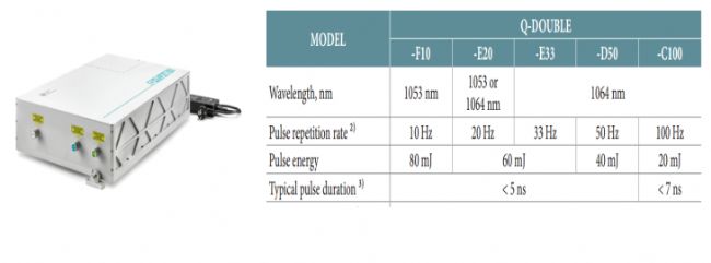 Q-Double激光器,它的主要特點(diǎn)為:產(chǎn)生具有可變時(shí)間間隔的兩個(gè)脈沖。它的目標(biāo)應(yīng)用是PIV(粒子圖像測(cè)速),LIBS(激光誘導(dǎo)擊穿光譜)。在10 Hz脈沖重復(fù)頻率下,激光器的總脈沖能量可配置為高達(dá)160 mJ,在100 Hz重復(fù)頻率下產(chǎn)生高達(dá)40 mJ的脈沖能量。脈沖持續(xù)時(shí)間為 5-10 ns,時(shí)間間隔10 ns – 100 ms。Q-DOUBLE兼容H-SMART倍頻器。