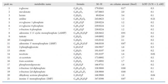 表1 21種代謝物在cap IC-Orbitrap平臺的最低檢測限(LODs)