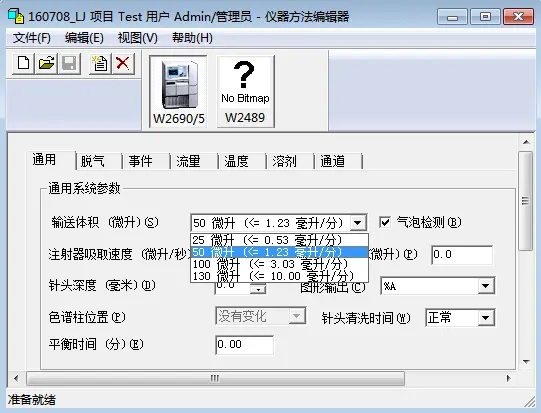 在“通用”界面中可根據實驗方法要求的流速來設置“輸送體積”的大小(如圖2所示),例如流速為1.0ml/min時將“輸送體積”的大小設為50微升。