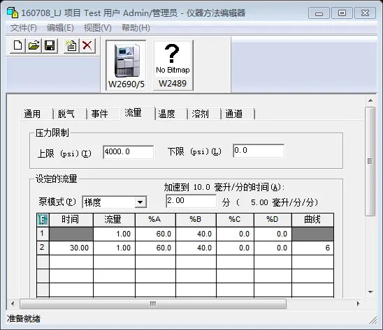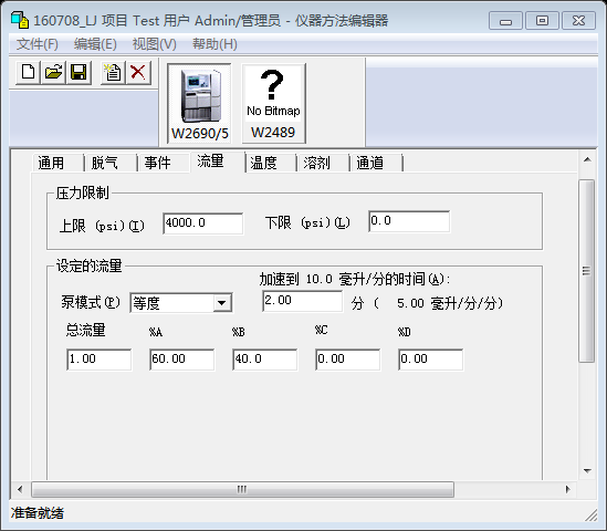 分離模塊的方法編輯主要包括:通用、脫氣、時間、流量、溫度、溶劑和通道。