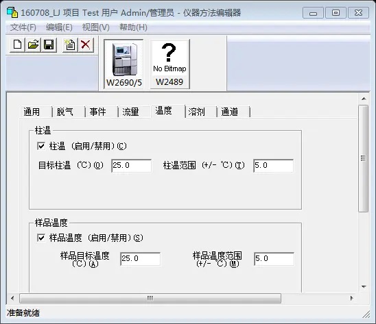 在如下圖9所示的“溫度”選項卡中勾選“柱溫”則可設置柱溫箱的設定溫度,“柱溫范圍”是指柱溫箱的溫度控制在目標溫度上下浮動柱溫范圍之內。如配備樣品盤控溫模塊亦可設置“樣品目標溫度”。
