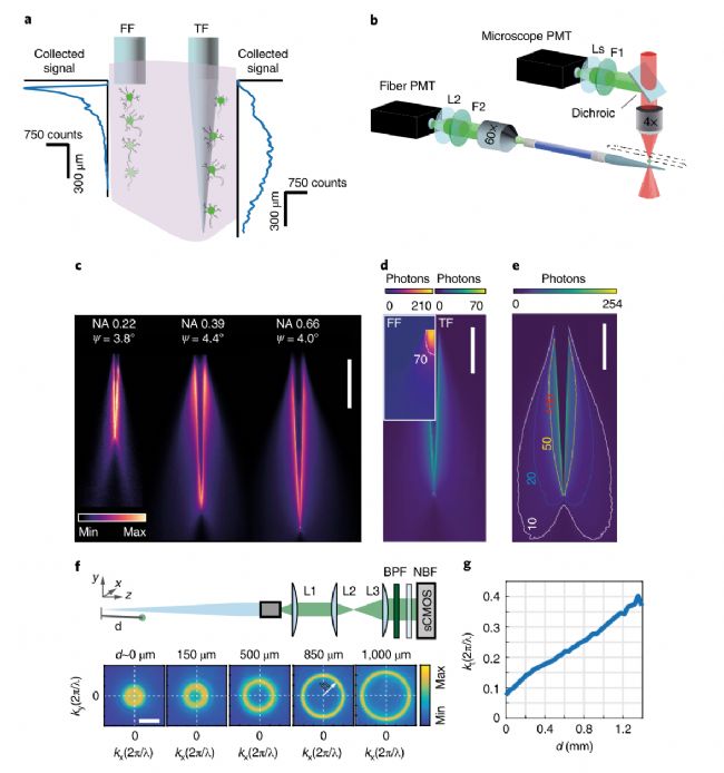 圖1 |錐形光纖的光收集。a,腦組織中扁平切割光纖(FF)和錐形光纖(TF)的光采集示意圖。實(shí)驗(yàn)收集概況旁邊的纖維。b,對(duì)錐形光纖的光采集場(chǎng)成像的光學(xué)設(shè)置。在pbs -熒光素滴中,一個(gè)圍繞錐形光纖的雙光子激發(fā)點(diǎn)被掃描。產(chǎn)生的熒光可通過未脫膜的PMT(顯微鏡PMT)和補(bǔ)片光纖遠(yuǎn)端的光纖PMT檢測(cè)。Ls,透鏡系統(tǒng);F1和F2,帶通熒光濾波器;L2,鏡頭。c,在PBS-熒光素溶液中,隨著NAs的增加錐形光纖的典型ξT(x,y)集合字段(每個(gè)字段歸一化到其zui大值);比例尺,500µm。d,比較在pbs -熒光素溶液中掃描的雙光子熒光光斑采集的光子數(shù)(像素停留時(shí)間,3.2µs),內(nèi)嵌扁平切割光纖與NA = 0.66, ψ = ~4°的錐形光纖;FF圖中的等值線顯示錐形光纖收集到的zui大光子數(shù)。比例尺,500µm。e, NA-0.66 錐形光纖在pbs -熒光素溶液中的光子收集的等距線(頂部色條,每個(gè)像素的光子數(shù);停留時(shí)間,3.2µs);等值線在10、20、50和100光子處繪制。比例尺,500µm。f,上,遠(yuǎn)場(chǎng)成像系統(tǒng)示意圖。L1、L2、L3,成像鏡;BPF,帶通濾波器;NBF,近紅外阻斷濾波器;sCOMS,科學(xué)互補(bǔ)金屬氧化物半導(dǎo)體。底部,纖維輸出小關(guān)節(jié)的遠(yuǎn)場(chǎng)圖像顯示,當(dāng)光源沿著錐形光纖移動(dòng)時(shí),直徑增加的環(huán)。比例尺,0.3 2π/λ。g, 錐形光纖在距離錐尖d處采集的點(diǎn)狀光源熒光的橫向矢量分量kt。a-d的實(shí)驗(yàn)重復(fù)了至少10次,得到了相似的結(jié)果。
