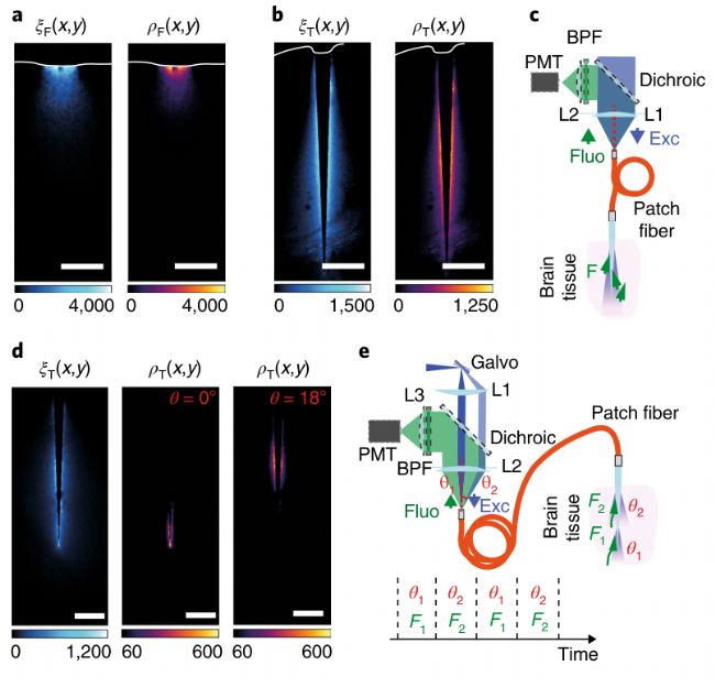 圖2 |可重構(gòu)的錐形光纖光收集。a,與熒光素均勻染色腦片皮質(zhì)接觸的0.66 NA 扁平切割光纖的光采集場(chǎng)ξ(x,y)(左)和光度效率場(chǎng)ρ(x,y)(右)。b,與a一樣,將0.66-NA 錐形光纖插入經(jīng)熒光素均勻染色的腦切片中。c,使用全NA照明和藍(lán)色激光刺激并收集大大腦區(qū)域熒光的系統(tǒng)示意圖。收集的光在貼片光纖中反向傳播,并通過一個(gè)二色鏡將其導(dǎo)向PMT與藍(lán)光區(qū)分開來。L1和L2,晶狀體;BPF,帶通濾波器;Fluo,熒光信號(hào);Exc,激發(fā)光。d,定點(diǎn)照明將采樣體積限制在錐形光纖的子區(qū)域。左,集光域ξT(x,y);中心,在光纖尖端選擇性照明得到的光度效率場(chǎng)ρT(x,y);右,ρT(x,y)視場(chǎng)是在較寬錐度直徑下選擇性照明獲得的。e,提出的多站點(diǎn)光度測(cè)量系統(tǒng)的原理圖,該系統(tǒng)使用時(shí)分復(fù)用配置的PMT探測(cè)器。藍(lán)色激光束以增加的輸入角(θ1, θ2)射入光纖貼片線。低角度注入時(shí),激光在錐尖處耦合,產(chǎn)生熒光信號(hào)F1;相反,當(dāng)在θ2處注入時(shí),激光在較大錐度直徑下耦合,產(chǎn)生熒光信號(hào)F2。熒光由PMT檢測(cè),其輸出信號(hào)與光注入刺激同步。該熒光信號(hào)根據(jù)其時(shí)間戳歸屬于相應(yīng)的區(qū)域。a、b、d實(shí)驗(yàn)重復(fù)三次,結(jié)果相似。