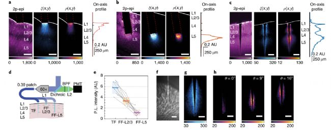 對(duì)于錐形光纖,我們使用了0.39-NA 錐形光纖 (ψ = ~4°)和扁平切割光纖來刺激和檢測(cè)Thy1-ChR2-eYFP小鼠固定腦片不同皮質(zhì)層的熒光,其中EYFP僅限于L2/3和L5(圖3a-c)。我們測(cè)量了三種實(shí)驗(yàn)配置的ξ(x,y)、β(x,y)和ρ(x,y)場(chǎng):靠近淺層的FF(圖3a)、插入L5層的FF(圖3b)和穿過皮質(zhì)范圍的錐形光纖 (圖3c)。正如預(yù)期的那樣,錐形光纖刺激并收集了L2/3和L5層的熒光,而扁平切割光纖在靠近關(guān)節(jié)突的一個(gè)有限區(qū)域內(nèi)募集信號(hào),需要重新定位以處理這兩個(gè)區(qū)域。此外,光纖纖維鈍的幾何輪廓阻礙了光纖的插入,因?yàn)楫?dāng)光纖穿過切片時(shí),移位的組織仍然在關(guān)節(jié)突的前面。