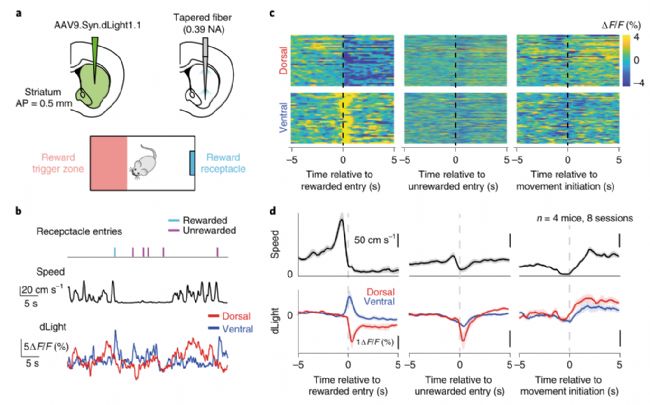 圖4 |體內(nèi)多點(diǎn)光度法揭示了多巴胺對(duì)背側(cè)紋狀體和腹側(cè)紋狀體運(yùn)動(dòng)和獎(jiǎng)勵(lì)的不同反應(yīng)。a,頂部,用于活體光纖光度測(cè)定的手術(shù)部位和兩個(gè)部位錐形光纖照明示意圖。下面是行為室的示意圖。紅色區(qū)域表示鼠標(biāo)需要進(jìn)入盒子的區(qū)域來觸發(fā)容器(藍(lán)色)中的食物顆粒的遞送。在獎(jiǎng)勵(lì)交付后,至少需要30秒的時(shí)間才能交付另一個(gè)獎(jiǎng)勵(lì)。b,來自一只老鼠的光度信號(hào)示例。上面,行為時(shí)間戳是通過紅外光束在容器中測(cè)出的。青色,獎(jiǎng)賞的容器入口;洋紅色,沒有獎(jiǎng)勵(lì)的容器入口。中間,動(dòng)物的中心速度。底部,dLight光度信號(hào)。紅色,來自背部的信號(hào);藍(lán)色,腹側(cè)信號(hào)。c,來自示例小鼠的所有試驗(yàn)的dLight光度信號(hào)的熱圖(兩個(gè)階段)。上方,來自背部的信號(hào)。底部,來自腹側(cè)的信號(hào)。每一行代表一個(gè)單獨(dú)的試驗(yàn)。N = 37次獎(jiǎng)勵(lì)容器進(jìn)入試驗(yàn)。N = 435例無獎(jiǎng)勵(lì)進(jìn)入容器的試驗(yàn)。N = 52次運(yùn)動(dòng)啟動(dòng)試驗(yàn)。d,小鼠所有會(huì)話的平均速度和dLight光度信號(hào)。來自背部的信號(hào)顯示為紅色;來自腹側(cè)的信號(hào)顯示為藍(lán)色(n = 8次,來自4只小鼠)。陰影區(qū)域代表會(huì)話平均值的標(biāo)準(zhǔn)誤差。