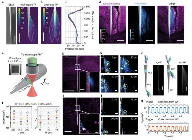圖5 |用微結(jié)構(gòu)錐形光纖設(shè)計(jì)集光體積。a,左,半金屬化TF的掃描電子顯微圖(SEM)。右,在pbs -熒光素溶液中,ξ(x,y)場(chǎng)對(duì)半涂覆的0.39-NA TF。b, ξ(x,y)場(chǎng)在pbs -熒光素溶液中。等值線分別用白色、黃色和紅色表示每像素5、10和20個(gè)光子(停留時(shí)間3.2µs)。c, ξ(x,y)對(duì)于半涂覆錐形光纖(紅色)和未涂覆錐形光纖(藍(lán)色)的場(chǎng)分布。d,在固定的腦切片中收集半涂層TF (Thy1-ChR2-EYFP小鼠)。從左到右:雙光子表熒光,ξ(x,y)場(chǎng),合并表熒光(品紅)和ξ(x,y)(青色)。比例尺(a-d), 250µm。e,設(shè)置用于表征從光學(xué)窗口的光收集。插圖,正方形窗的SEM顯微圖(W = ~45µm, L = ~ 1250µm)。f,與L和W相比,由采集等值面包圍的pbs -熒光素溶液的采集量分別為zui大采集量的10%、20%、40%、60%、80%(補(bǔ)充圖6)。g,固定腦片(Thy1-ChR2-EYFP小鼠)的方形窗光采集(W = ~45µm, L = ~750µm);該圖像顯示了ξ(x,y)域(青色)與同時(shí)獲得的雙光子表觀熒光圖像(品紅)的疊加;比例尺,500µm。插入,放大窗口;比例尺,50µm。h,在光學(xué)窗口上方隨高度增加的Z-stack(0、20、40、60µm)。錐形光纖配置文件和窗口位置用白色表示。比例尺,10µm。i,與g一樣,當(dāng)TF的時(shí)間窗W = ~20µm時(shí),L = ~230µm;比例尺,100µm(插圖,10µm)。l,如h,對(duì)于W = ~20µm的光學(xué)窗口:高度為0、15、30、50µm的z-stack;比例尺,10µm。m,設(shè)置用于選擇地點(diǎn)的照明和收集。錐形光纖被淹沒在pbs -熒光素滴中。激光束脈沖(10 Hz, 50 ms, 473 nm)在受控θ下注入(補(bǔ)充圖7c)。比例尺,500µm。n,從W1和W2窗口測(cè)量的熒光信號(hào),通過操縱θ獨(dú)立激活(熒光信號(hào)通過減去自身熒光校正)。c、d、g-l、n實(shí)驗(yàn)重復(fù)3次,結(jié)果相似。