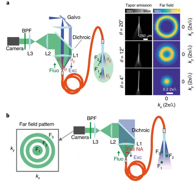 圖6 |利用遠(yuǎn)場(chǎng)成像進(jìn)行深度分辨光纖測(cè)光的檢測(cè)方案。a、遠(yuǎn)場(chǎng)檢測(cè)熒光支持時(shí)分復(fù)用,提高深度選擇性。b,通過全NA刺激實(shí)現(xiàn)遠(yuǎn)場(chǎng)檢測(cè),實(shí)現(xiàn)基于反向傳播熒光的kT值的純分模解復(fù)用。Fluo,熒光信號(hào);Exc,激發(fā)光。