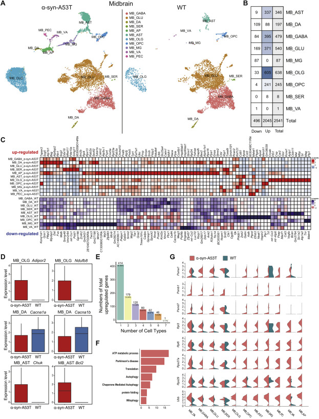 根據(jù)α-syn-A53T和WT的不同樣本,將同一簇的細(xì)胞分裂(圖2A)。中腦中的所有細(xì)胞類型在兩個樣本中都是共享的。盡管如此,人們發(fā)現(xiàn)還有另一個細(xì)胞簇,定義為與PD相關(guān)的細(xì)胞(MB_AP),僅出現(xiàn)在α-syn-A53T中腦(圖2A),不表達(dá)任何已知的細(xì)胞標(biāo)志物(圖1C)。據(jù)推測,MB_AP是一組受α-syn基因敲入影響的細(xì)胞,由中腦內(nèi)不同類型的細(xì)胞組成。由于在敲入基因的影響下,一些相似的細(xì)胞進(jìn)程發(fā)生了變化,細(xì)胞表達(dá)了相似的特征并聚集在一起。為了確保差異表達(dá)基因(DEGs)的統(tǒng)計(jì)能力,我們排除了α-syn-A53T或WT中少于三個細(xì)胞的細(xì)胞類型。在大多數(shù)細(xì)胞類型中,α-syn-AP3T和WT之間存在大規(guī)模的轉(zhuǎn)錄改變。在中腦中總共鑒定出2045個上調(diào)的DEGs和496個下調(diào)的DEGs(圖2B;表S3),細(xì)胞類型特異性基因的表達(dá)譜如圖2C所示。