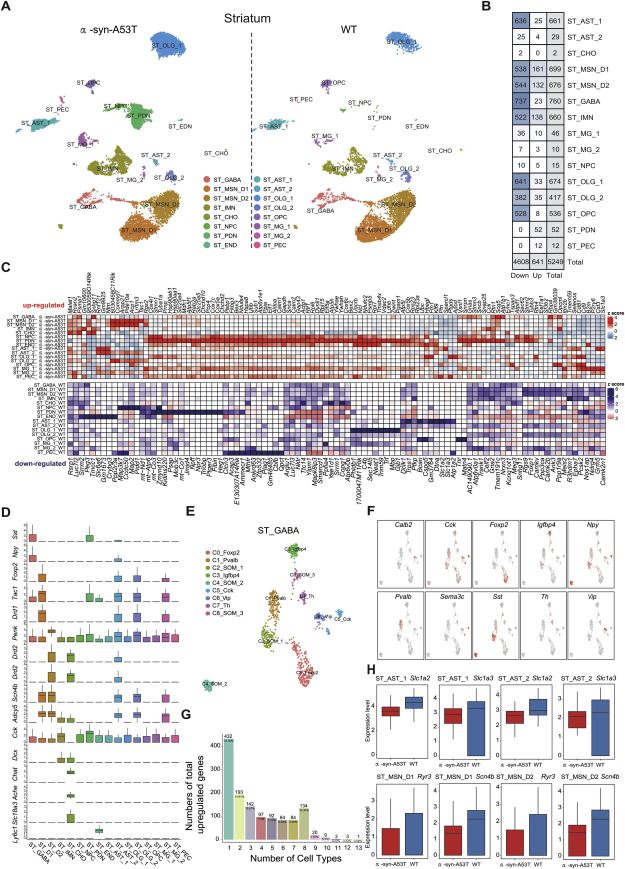 根據(jù)α-syn-A53T和WT的兩個不同樣本對紋狀體細(xì)胞進(jìn)行分裂(圖3A),在紋狀體中鑒定出641個上調(diào)的DEGs和4608個下調(diào)的DEGs(圖3B)。紋狀體中細(xì)胞類型特異性基因的表達(dá)譜如圖3C所示,其中紋狀體中細(xì)胞對選定DEGs的表達(dá)是特異的(圖3D)。具體來說,根據(jù)D1型(DRD1)和D2型受體(DRD2)的表達(dá),紋狀體MSNs可以進(jìn)一步分為兩類已知的MSNs。我們鑒定出D1型M-SN和D2型MSNs分別高度表達(dá)Drd1、Tac1和Drd2、Penk(表S2)。ST_GABA可以進(jìn)一步分為已知的亞群,包括Npy+Sst+(C2_SOM-1、C4_SOM-2、C8_SOM-3)、Vip+(C6_Vip)、Pvalb+(C1_Pvalb)、Th+(C7_Th)和Cck+(C5_Cck)(圖3E和3F)。除此之外,我們注意到C0和C3分別高度表達(dá)Foxp2和Igfbp4,這可能負(fù)責(zé)紋狀體中的特定功能(圖3E和3F)。ST_IMN的特征是未成熟神經(jīng)元標(biāo)記物的不同表達(dá),如Dcx(圖S2B)。在α-syn-A53T中上調(diào)的所有DEGs中,近三分之二在多種細(xì)胞類型中上調(diào)(圖3G),表明由于突變體Snca的插入,紋狀體中不同細(xì)胞類型的基因表達(dá)變化具有一定的相似性。