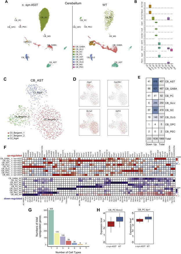 在小腦中,根據(jù)經(jīng)典的神經(jīng)元標(biāo)記物鑒定出GABA能神經(jīng)元、谷氨酸能神經(jīng)元浦肯野細(xì)胞、顆粒細(xì)胞和神經(jīng)膠質(zhì)細(xì)胞(圖4A和4B)。特別是在CB_AST中,除了經(jīng)典的AST標(biāo)記Slc1a3和Aqp4外,Bergmann膠質(zhì)細(xì)胞還被鑒定為Gdf10的高表達(dá)(圖4C和4D)。通過差異基因分析,我們在小腦中鑒定出1636個上調(diào)的DEGs和233個下調(diào)的DEGs(圖4E和4F;表S3),與紋狀體相比,其中大多數(shù)DEGs對單一細(xì)胞類型具有特異性(圖4G)。