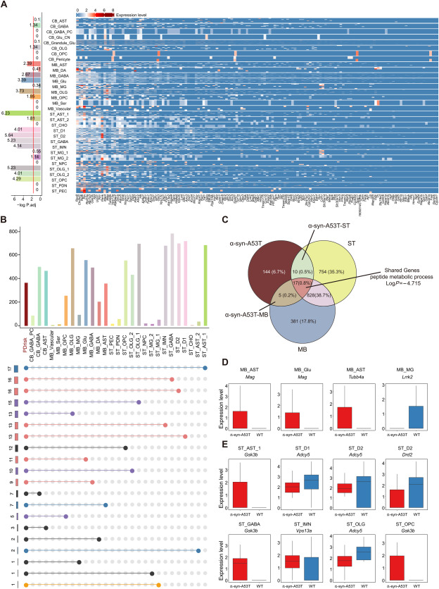 接下來,我們試圖找到對PD進(jìn)展有顯著影響的特定細(xì)胞類型。為了實(shí)現(xiàn)這一目標(biāo),使用從DisGeNET檢索的PD風(fēng)險基因進(jìn)行了過度代表性分析(Piñero等人,2017)。由于AST已被深入報道通過將α-syn轉(zhuǎn)移到多巴胺能神經(jīng)元來促進(jìn)PD進(jìn)展,我們接下來檢查了AST的富集水平,發(fā)現(xiàn)PD風(fēng)險基因在中腦和紋狀體AST群體中富集(包括MB_AST、ST_AST_1、ST_ATS_2),但在小腦中不富集(圖5A)。中腦和紋狀體中的少突膠質(zhì)細(xì)胞譜系(MB_OLG、MB_OPC、S_OLG_1、ST-OLG_2、ST-OPC和CB_OLG)在PD病理中起著模糊的作用,在不同程度上顯示出PD風(fēng)險基因的強(qiáng)烈富集,這表明可能存在導(dǎo)致PD早期發(fā)生和發(fā)展的未經(jīng)探索的線索。具體來說,ST_OLG_1的富集度得分為5.23,其次是ST_OPC的4.29,ST_OLG_2的4.01,MB_OLG的3.73,MB_OPC的1.85,CB_OLG的1.34(圖5A)。盡管如此,只有2種小腦細(xì)胞類型(CB_GABA、CB_OLG)富集了PD風(fēng)險基因,這與先前的知識一致,因?yàn)樾∧X直到Braak V期才受到嚴(yán)重影響(Poewe等人,2017)。