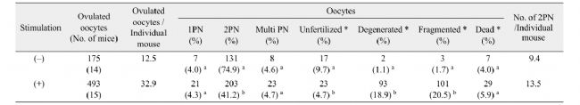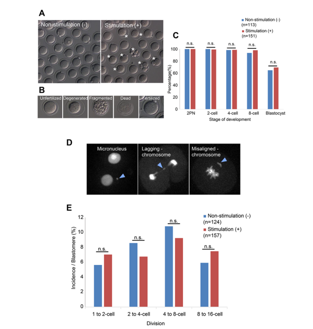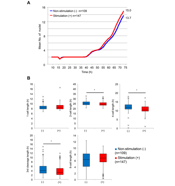 刺激(+)組獲得的受精卵細胞數量是非刺激(-)組的 1.4 倍。各組的發育速度和染色體穩定性沒有差異。圖像分析表明,刺激(+)組的平均發育速度略高于非刺激(-)組。這種速度的提高似乎是由于 2 細胞期和 4 細胞期以及第三次分裂的長度略有縮短,從而使每個胚胎的分裂時間同步,而不是由于出現了一個發育極快的胚胎亞群。