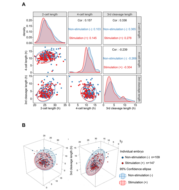 圖4.用置信橢圓表示刺激(+)和(-)組的2細胞、4細胞和第三個分裂階段長度之間的關系