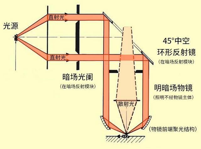 反射暗場光路原理跟透射暗場光路一致,只是結(jié)構(gòu)有些變化,除了多了個環(huán)形反射鏡產(chǎn)生反射照明,其物鏡前端也有特殊的反射結(jié)構(gòu)來反射聚光,這種物鏡就是BD明暗場物鏡。