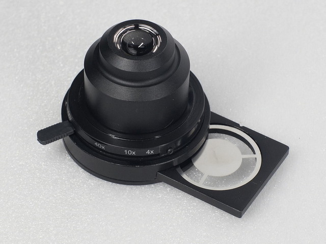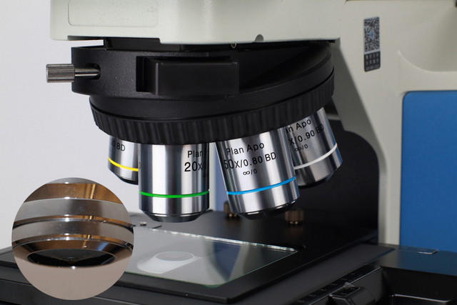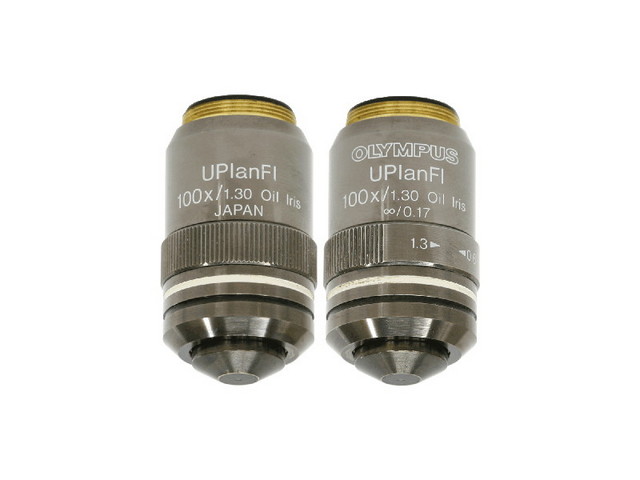 原則上,透射的暗場觀察無需特別的暗場物鏡,直接用普通物鏡即可。例外情況是100X物鏡,由于100X物鏡的N.A起碼都有1.25,而暗場照明要求照明N.A顯著大于物鏡N.A,因此連上述的U-DCW油浸式暗場聚光鏡都帶不動一個普通Plan 100X. 為了滿足暗場使用,部分100X物鏡會加入可變光闌,用來降低物鏡N.A,以匹配暗場聚光鏡N.A.