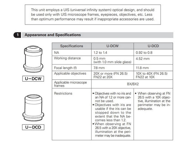 專業(yè)的暗場聚光鏡有很多種,特點是特殊結(jié)構(gòu),帶來特別高的N.A.以UIS系統(tǒng)的U-DCW油浸式暗場聚光鏡為例,其照明N.A可以到1.2-1.4,可以使用20X以上,N.A1.2以下的高倍物鏡。這種聚光鏡使用比較費工夫,需要對中,并且滴油時不能有氣泡,否則暗場效果不佳。