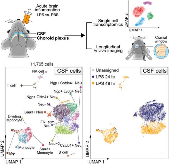文章摘要:脈絡(luò)叢(Choroid plexus,ChP)是重要的腦屏障和腦脊液 (CSF) 的來源。該研究使用小鼠的縱向雙光子成像和單細胞轉(zhuǎn)錄組學來闡明 ChP 調(diào)節(jié)腦炎癥的機制。研究使用腦室內(nèi)注射脂多糖 (LPS) 來模擬小鼠的腦膜炎,并觀察到中性粒細胞和單核細胞在 ChP 基質(zhì)中積聚并穿過上皮屏障進入腦脊液。從外周雙向募集單核細胞以及從腦脊液向 ChP 募集巨噬細胞有助于消除中性粒細胞并修復屏障。單細胞轉(zhuǎn)錄組分析詳細描述了伴隨這一過程的分子步驟,并揭示了 ChP 上皮細胞暫時特化以滋養(yǎng)免疫細胞,協(xié)調(diào)它們的募集、存活和分化以及調(diào)節(jié)控制 ChP 腦屏障通透性的緊密連接。
