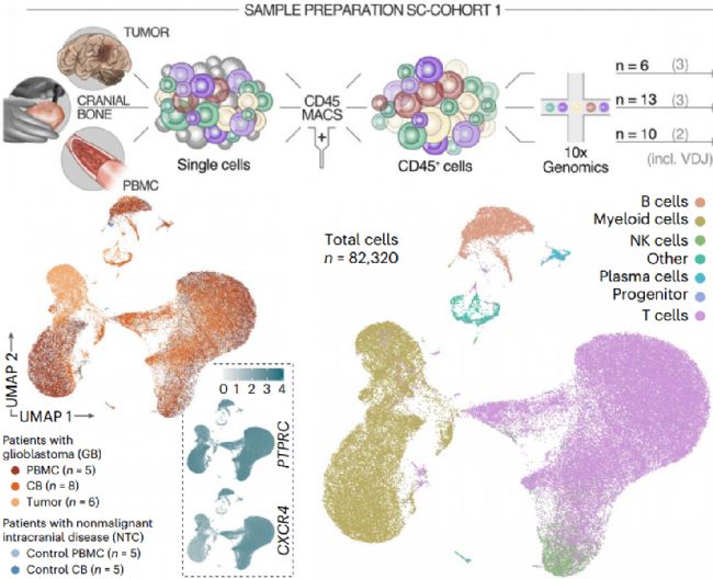 文章摘要:該研究利用來自患有膠質(zhì)母細胞瘤或非惡性顱內(nèi)疾病的患者的臨床細胞和組織標本,發(fā)現(xiàn)與未經(jīng)治療的膠質(zhì)母細胞瘤腫瘤相比,顱骨(CB)骨髓在初次診斷時就含有活躍的淋巴細胞群。臨床和解剖成像、單細胞轉(zhuǎn)錄組測序和免疫細胞分析以及腫瘤反應性的量化,確定了CB中的CD8+ T細胞克隆型,這些克隆型也在腫瘤中發(fā)現(xiàn)。這些克隆型的特征是植根于整個T細胞發(fā)育譜的急性和持久的抗腫瘤反應。與遠端骨髓相比,腫瘤近端的CB表達淋巴遷移標記物S1PR1的腫瘤反應性CD8+效應T細胞占比增加。總之,該研究探索了CB骨髓內(nèi)的免疫細胞庫,以評估它們與疾病相關(guān)功能。