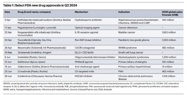 在醫藥科技日新月異的今天,美國食品藥品監督管理局(FDA)在2024年第二季度再次展現了其推動醫藥創新的強大動力,本季度共批準了11種新藥上市(見表1),涵蓋了抗腫瘤、抗感染等多個關鍵治療領域。這些新藥的涌現,不僅為患者帶來了新的治療選擇,也為全球制藥行業注入了新的活力。