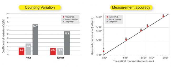 FACSCOPE® B先進的識別算法可以精確識別不規則和成團細胞,以及活細胞、死細胞和存活率,因為它的計數變化比血細胞計數器和其他計數器小,而且測量的濃度與理論濃度更接近,所以能提供更快速、更準確、更可靠的數據支持。這更有助于為新藥研發中的藥效評估、毒性測試及生物安全性研究提供堅實基礎。