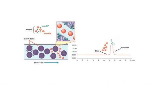 根據分子大小進行色譜分離的技術如今被稱為體積排阻色譜(SEC),該技術可追溯至20世紀50年代。這種分離技術基于分子大小進行色譜分離,而非基于分子的帶電情況或極性等化學特性,過去也被稱作凝膠過濾或凝膠滲透色譜(GPC)。具有特定孔徑分布的固定相顆粒可阻止大于柱床孔穴的樣品分子進入,從而使其快速洗脫出來,小分子則會進入孔穴中并深入更復雜的結構,洗脫速度較慢。因此,大分子最先洗脫,小分子則根據其在溶液中的大小以降序順序洗脫出來(圖6)。SEC是一種低分離度技術,采用等度方法且運行之間無需進行平衡。色譜柱載樣量取決于樣品體積和濃度,而這兩個因素都會影響分離度。